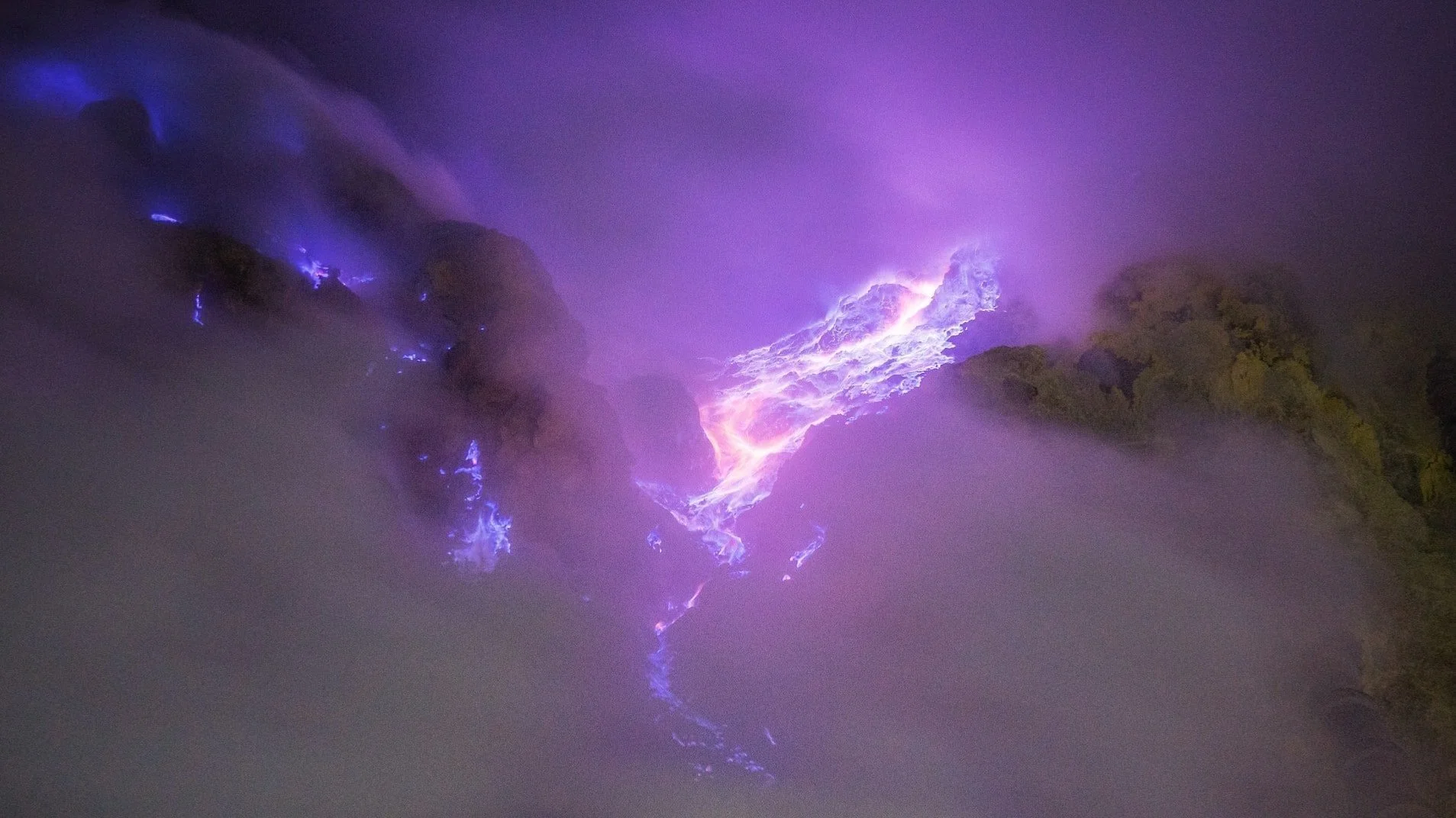 At around 5AM, at the bottom of the crater, the burning off of sulfur gas at almost 1,200 degrees (Fahrenheit) creates a unique phenomenon only visible in two places in the world - an intense blue flame gas that can look like lava in the air.